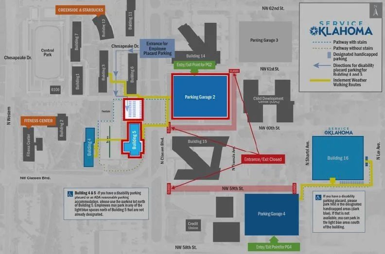 Parking is located just north of Building 5. Should this lot fill up, there is overflow parking in Parking Garage 2, just east of Building 5.